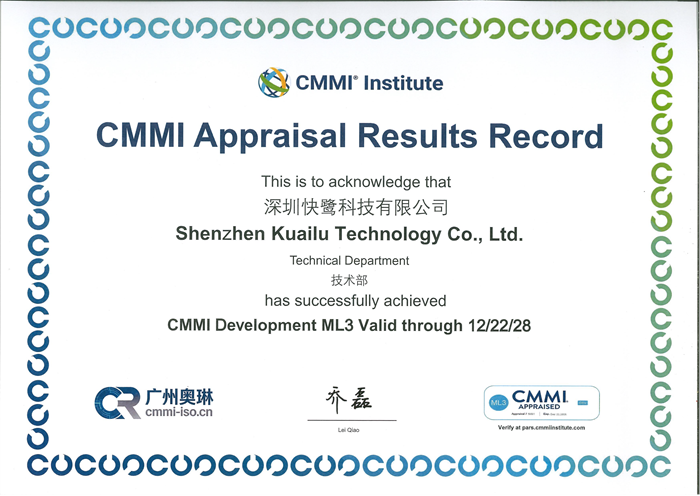 CMMI(能力成熟度模型集成)是全球软件行业最具权威的研发管理成熟度标准之一。通过CMMI 3级认证,表明快鹭科技已建立规范化的产品开发与管理流程,能够在项目规划、过程定义、质量管理及风险应对等方面实现全生命周期的精细化管理。