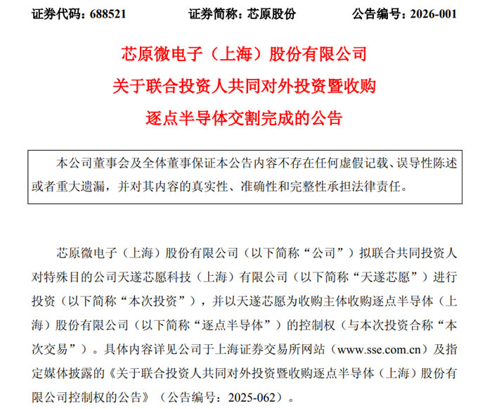 2026 年 1 月 7 日,芯原微电子 (上海) 股份有限公司(证券代码:688521,证券简称:芯原股份)发布公告(公告编号:2026-001)称,公司联合共同投资人对外投资暨收购逐点半导体 (上海) 股份有限公司(以下简称 “逐点半导体”)的相关交易已完成交割。