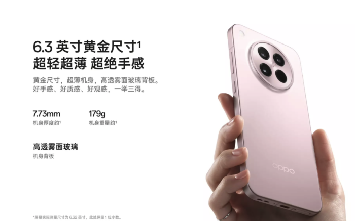 在设计方面,Find X8s采用极窄四等边直屏方案,机身轻薄紧凑,单手握持与操作都十分友好。即便在搭载天玑 9400+ 旗舰芯片、5700mAh 大电池以及潜望式长焦镜头的情况下,整机重量依然控制在 179g。得益于第二代芯片级屏幕封装工艺,Find X8s 将前代已十分出色的 1.45mm 边框进一步压缩至 1.25mm,上边框也收窄至 1.8mm,最终实现高达 93.5% 的屏占比,观感与手感兼顾。