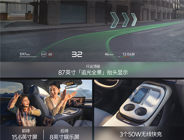 车内同样变化不大,配备15.6英寸中控屏、87英寸AR-HUD、前排双50W无线充电、一键躺平副驾零重力座椅、256色漫反射氛围灯、二排8英寸娱乐屏、带磁吸可折叠小桌板。