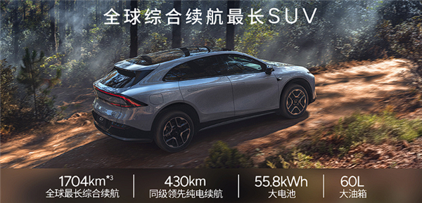 并将采用全域800V高压平台架构+5C超充大电池,配备55.8kWh电池组+60L大油箱,综合续航可达1704km,纯电续航430km,支持超快充,12分钟充电314km。
