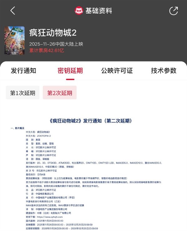 快科技1月8日消息,今天,《疯狂动物城2》密钥第二次延期,延长上映至2026年2月25日。