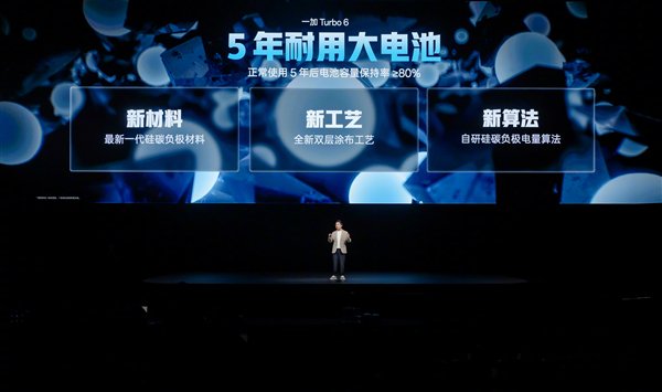 官方介绍,一加Turbo 6电池采用全新仿生球形硅碳负极材料,相比上一代类球形硅碳,电量循环有效改善30%,同时采用双层涂布工艺,配合自研的硅负极电池算法,在实现超长续航的同时,更显著提升了电池耐用性,用户使用五年后电池健康度仍可高于80%。