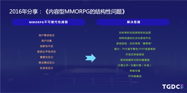 针对 MMORPG 的种种问题,杨峰列出了解决思路,当下中国的 MMORPG 游戏,基本都是按这个解决思路来走的。