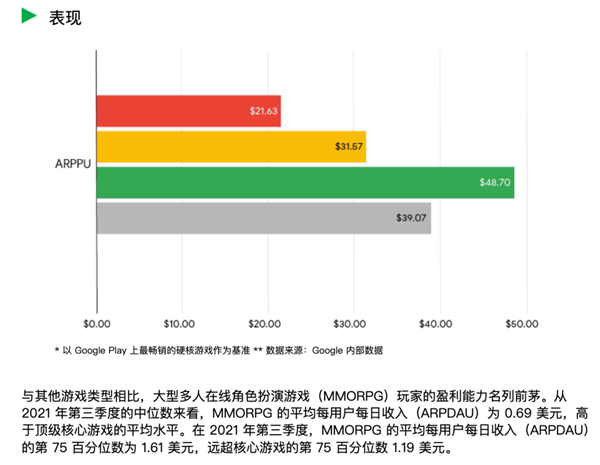 谷歌在 2022 年的报告里提到,MMORPG 在 Google Play 算是小众游戏,玩的人少,愿意花时间玩的更少,87% 的玩家只玩一款 MMORPG。不过 MMORPG 玩家的日均游戏时长更长,也比其他类型游戏的玩家更愿意消费。