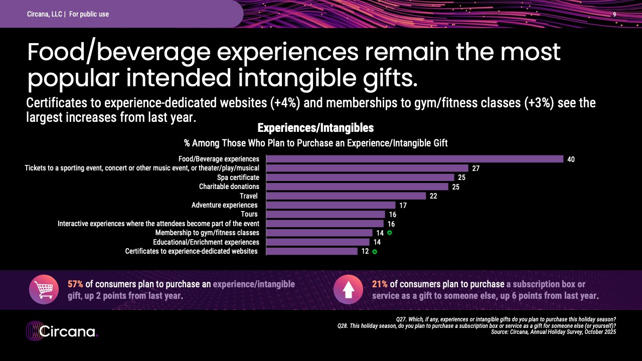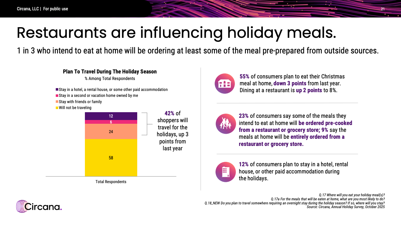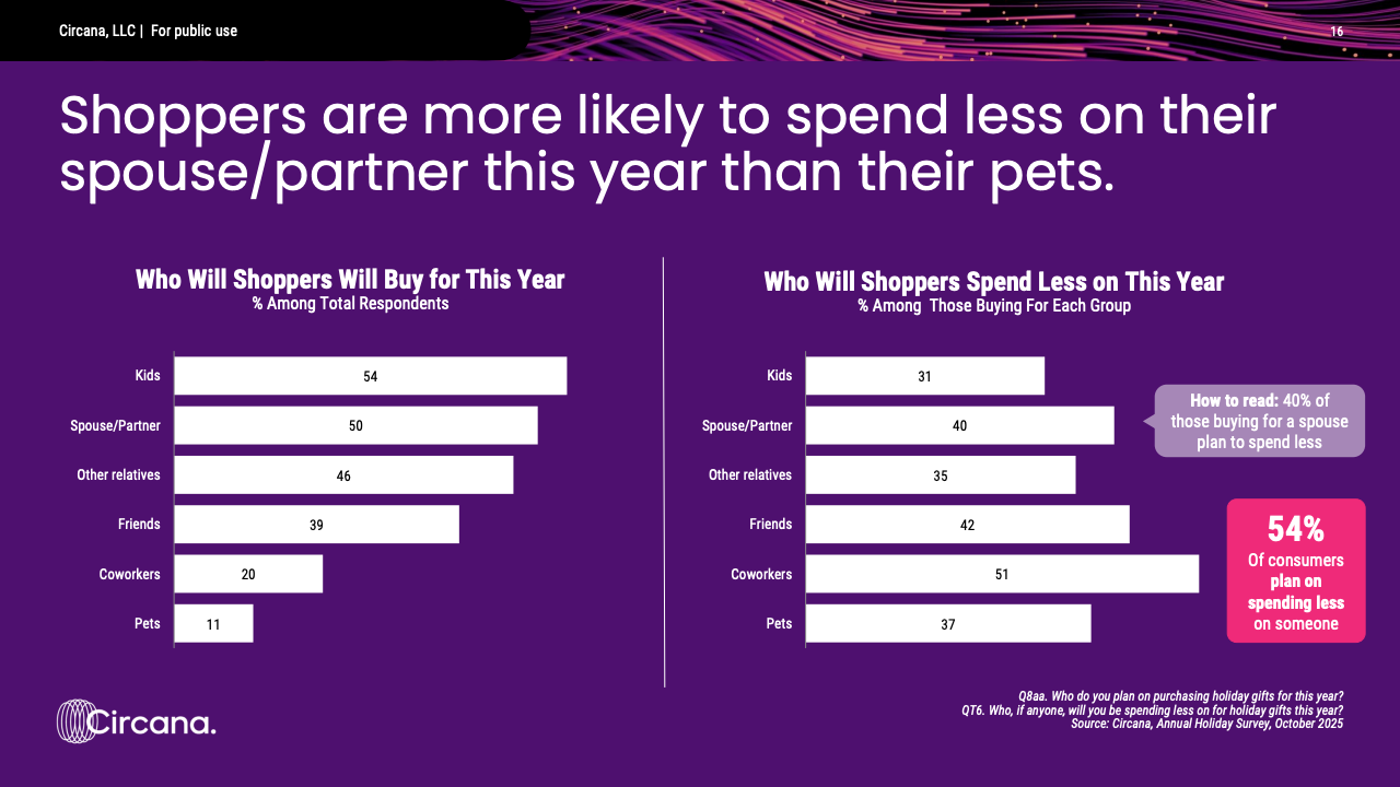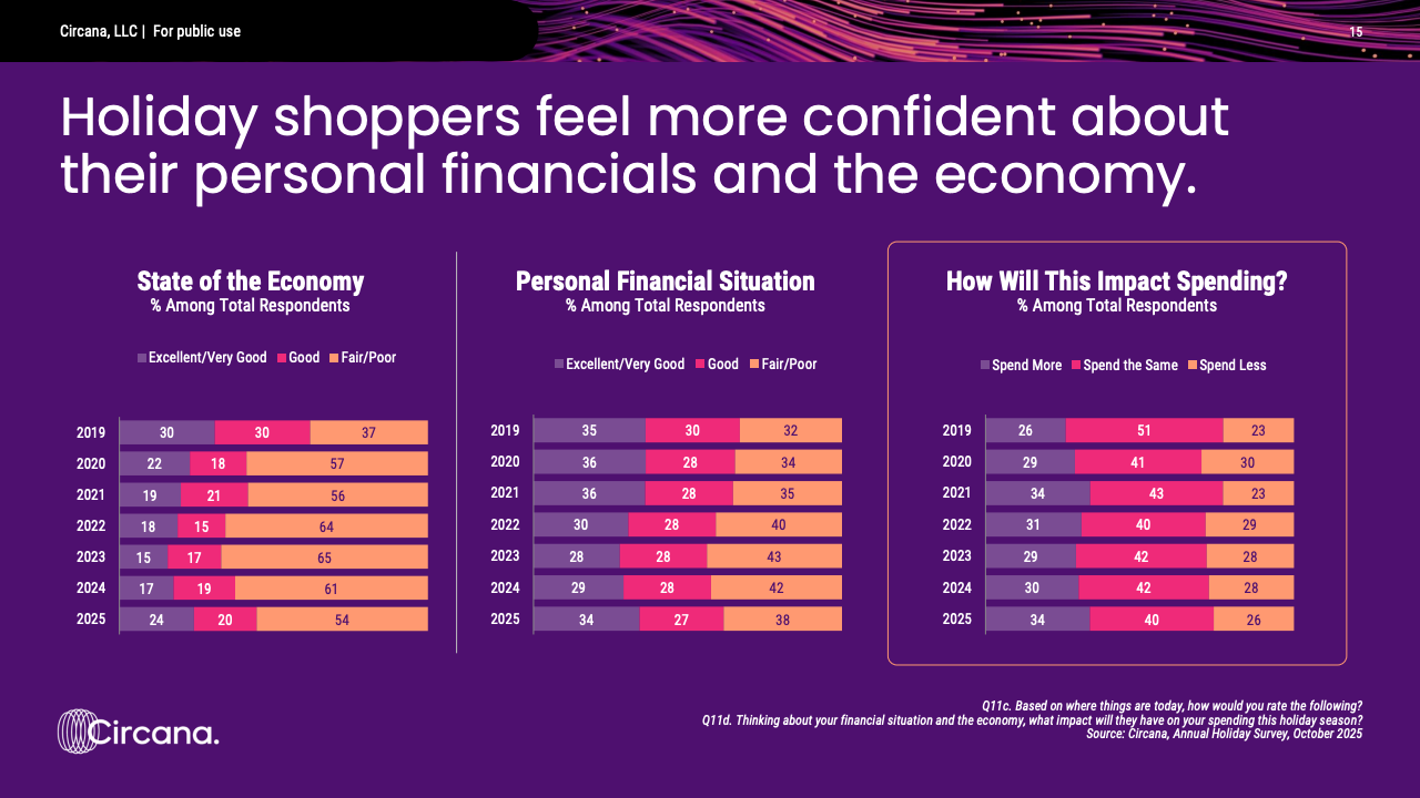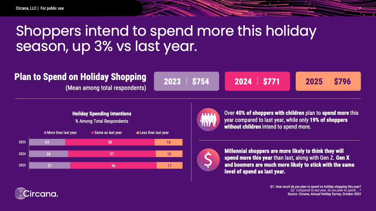 从人群差异看,假日消费的结构性分层更加明显。有孩子的家庭中,超过40%的消费者计划较去年增加支出,而无子女群体中仅19%选择增加。代际差异同样突出,Z世代和千禧一代更倾向于提高假日预算,X世代与婴儿潮一代则以“维持不变”为主。这种分化表明,假日消费的边际增量主要由年轻家庭与年轻世代贡献,而并非全体消费者普遍扩张 。