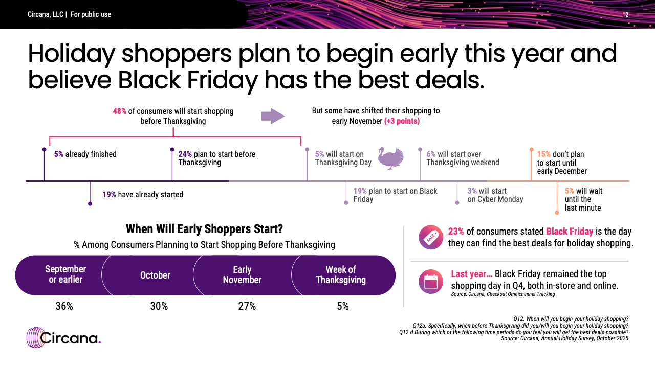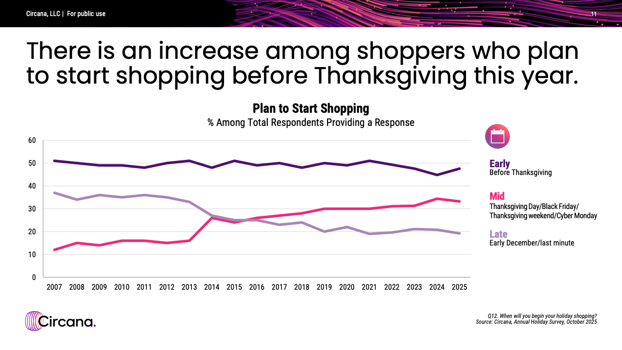 从购物行为看,时间前移与渠道碎片化并行。约48%的消费者计划在感恩节前启动假日购物,其中19%已提前开始;23%的消费者认为黑色星期五仍是最佳折扣时点。线上渠道渗透率持续走高,81%的消费者计划在线购物,47%主要通过智能手机完成下单,31%会在进店前进行线上比价。假日购物已从“集中爆发”转向“拉长周期、即时决策”的常态化模式 。