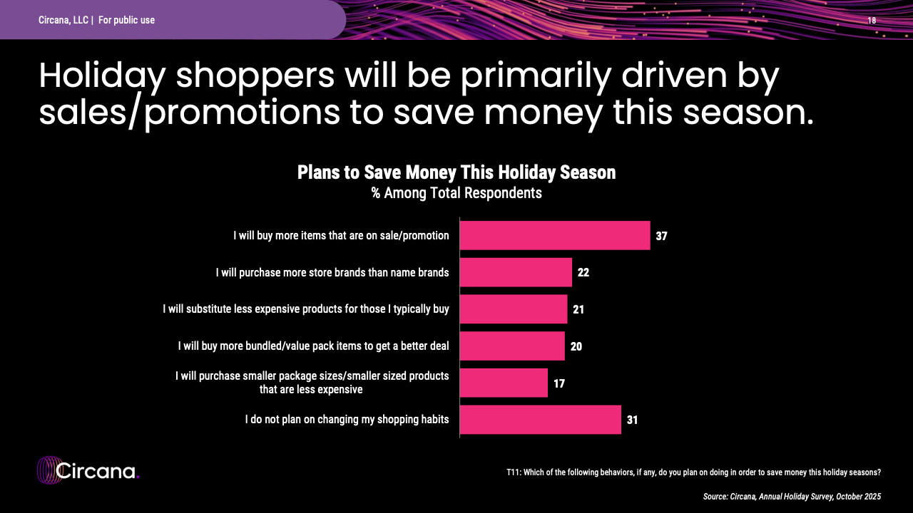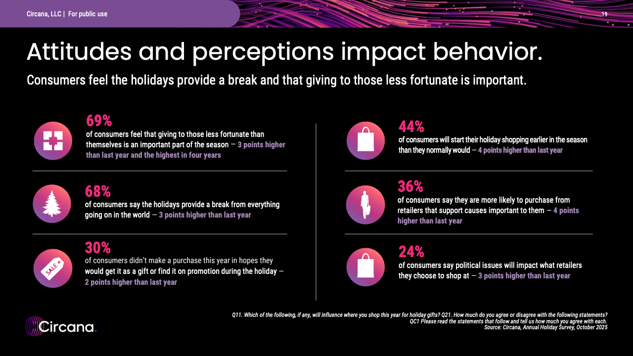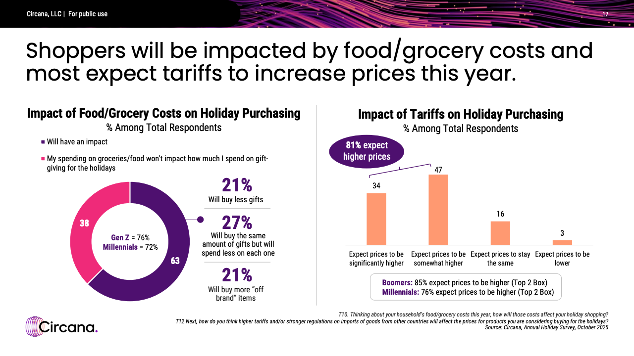 从价格与成本因素看,通胀与关税预期仍是核心变量。超过81%的消费者预计关税和进口监管将推高商品价格,63%的消费者明确表示食品和杂货成本会影响假日购物决策。其中21%计划减少礼品数量,27%选择维持数量但降低单件支出,另有21%转向更多“非品牌商品”。价格敏感度上升,使促销、折扣和性价比成为零售商竞争的决定性因素 。