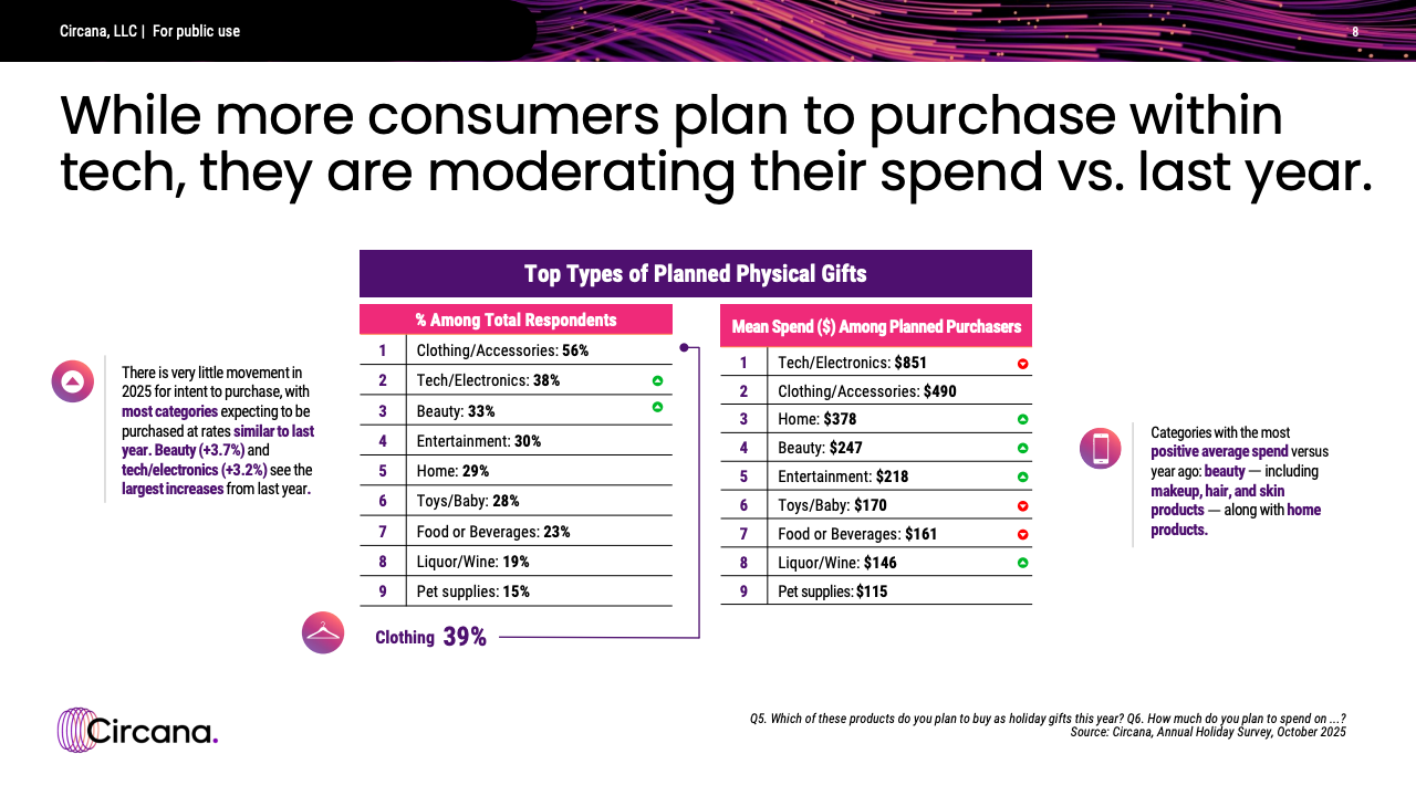 从品类结构看,消费优先级进一步分化。科技和电子产品依旧是金额最高的礼品品类,人均计划支出达851美元,但消费者在该领域的支出态度趋于克制。美容品类成为最具弹性的增长点,购买意向同比提升约3.7%,且在均价上行背景下仍获得正向支出增长。相比之下,服装和玩具类目面临压力,购买率和预算均缺乏明显改善,反映出实用性和“可负担的犒赏型消费”正在取代传统礼品逻辑 。