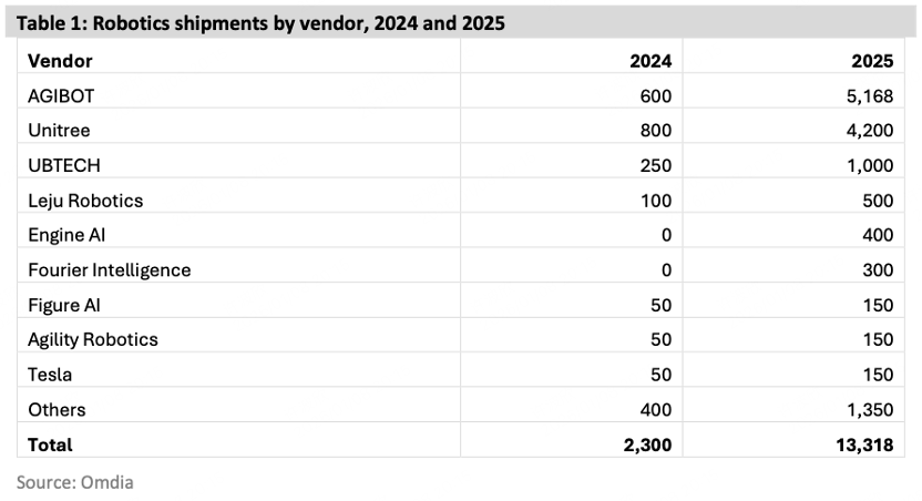 这当中,中国企业主导全球人形机器人市场格局:智元机器人以5168台的出货量位居榜首,占据全球39%的市场份额;宇树科技与优必选分列二、三位,出货量分别是4200台和1000台。