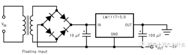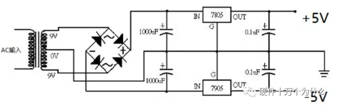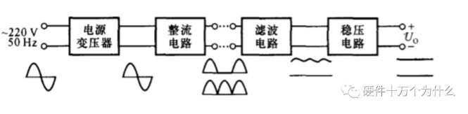 上图为典型的线性电源电路图,实现交流/直流的转换,市电220V经过变压器、镇流器、电容滤波,由线性稳压管实现需要的输出电压。