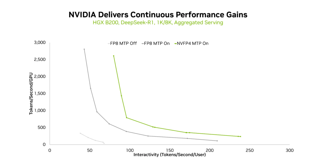 NVFP4 使用在完整的 NVIDIA 软件栈上(包括 TensorRT-LLM 和 NVIDIA TensorRT 模型优化器),以确保高性能并保持精度。这使得在给定交互级别下能够实现更高的吞吐量,并且在相同的 HGX B200 平台上,可以实现更高的交互级别。