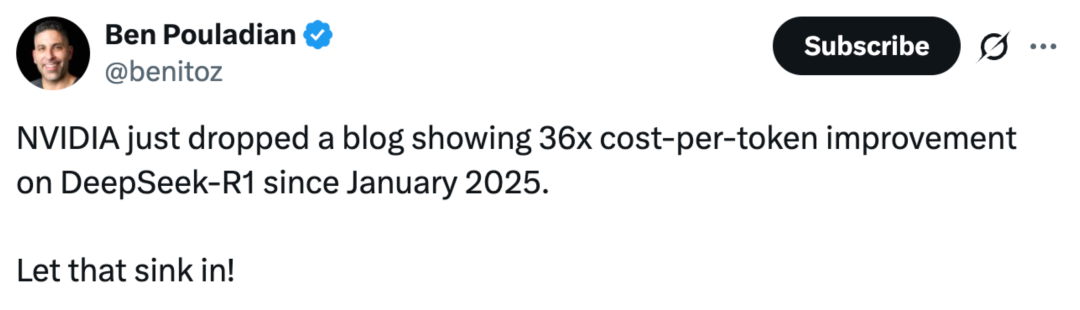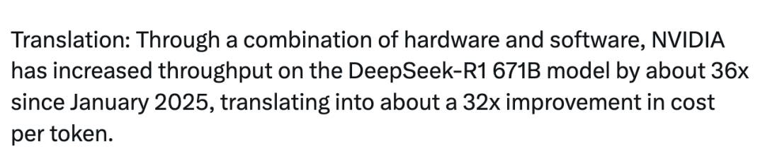 有业内人士对英伟达放出的一系列图表进行了直观的解读,用一组数据来总结就是,「通过软硬件的深度协同,自 2025 年 1 月以来,英伟达已经将 DeepSeek-R1 (671B) 的吞吐量提升了约 36 倍,这意味着单 Token 的推理成本降低到了约 1/32。」