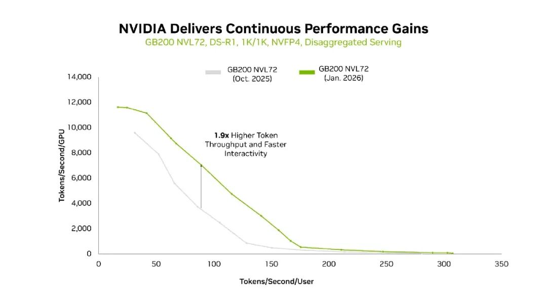 通过在 GPU、CPU、网络、软件、供电及散热方案上的深度协同设计,英伟达持续提升每瓦特 Token 吞吐量,从而有效降低了每百万 Token 的成本。此外,英伟达不断优化其软件栈,从现有平台中挖掘更强的性能潜力。
