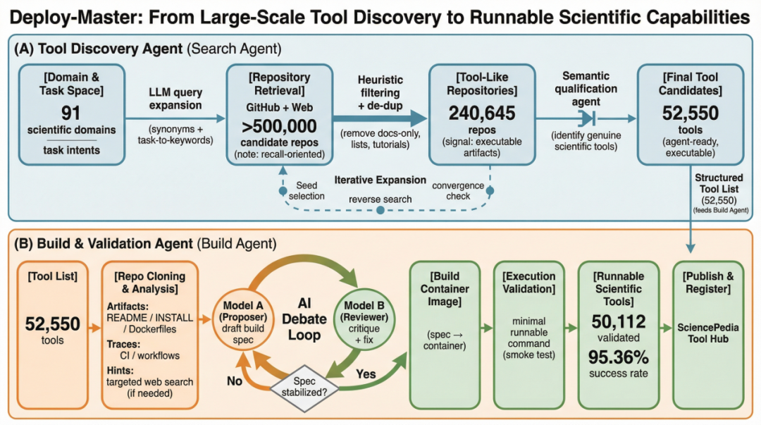 随后,我们通过结构启发式规则剔除明显不可执行的仓库,并由 Agent 进行语义判断,确认其是否构成一个可执行科学工具。通过这一多阶段漏斗流程,我们将最初约 50 万个仓库,收敛为 52550 个进入自动部署流程的科学工具候选。这一步的意义,不仅在于筛选工具,更在于第一次以结构化方式刻画了真实科学工具世界的规模与边界。