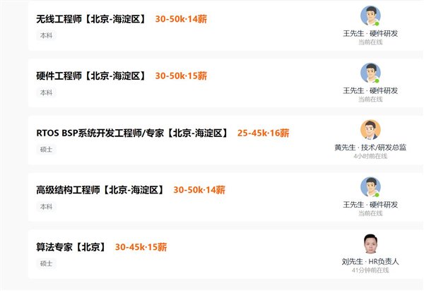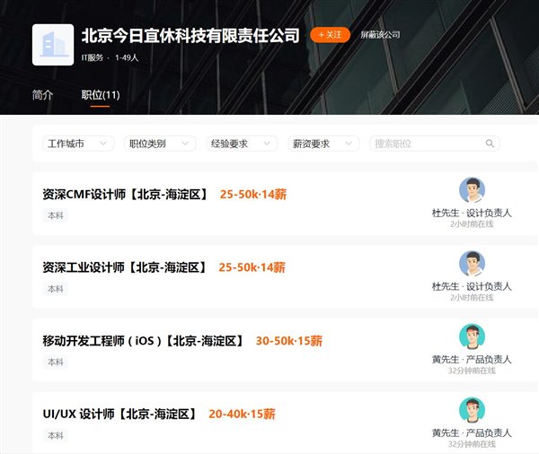猎聘网显示,北京今日宜休科技有限责任公司招聘的岗位包括资深CMF设计师、资深工业设计师、移动开发工程师、UI/UX设计师、音频硬件工程师、无线工程师、高级结构工程师以及算法专家等十几个研发岗位。薪资待遇在20K-50K之间,最低是14薪,最高是16薪。