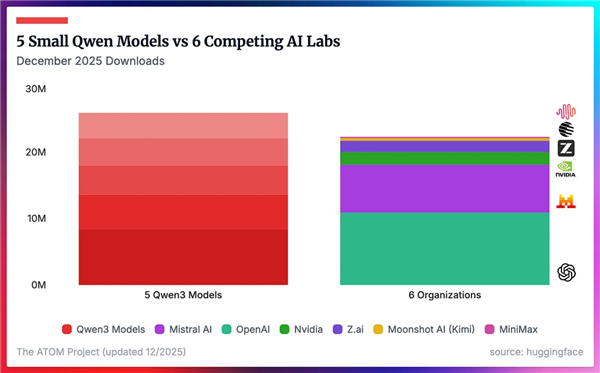 仅凭5款小尺寸模型,其在2025年12月的单月下载量便已超越 Mistral、OpenAI、英伟达等6家国际领先AI厂商旗下所有开源模型当月下载量的总和。