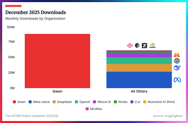 仅在2025年12月,千问模型下载量便超过了2到9名总和,包括Meta、DeepSeek、OpenAI、Mistral、英伟达、智谱、月之暗面、MiniMax。