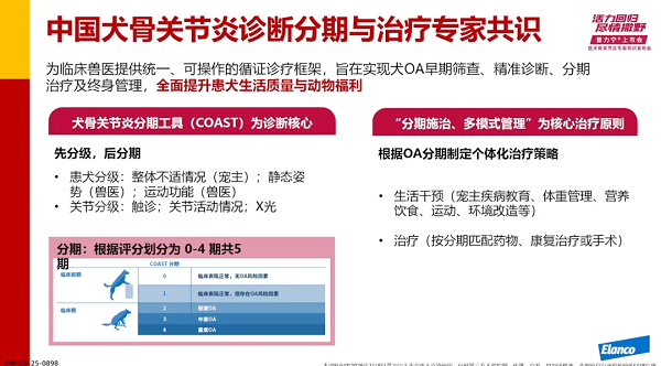 接下来,中国农业大学动物医院手术中心主任石磊,带来犬骨关节炎专家共识介绍和诊疗经验分享,指出共识为临床兽医提供统一、可操作的循证诊疗框架,旨在实现犬骨关节炎早期筛查、精准诊断、分期治疗及终身管理,全面提升患犬生活质量与动物福利。诊断以COAST为准则,遵循“先分级、后分期”。治疗上确立“分期施治、多模式管理”原则。COAST将犬骨关节炎划分为5个连续且明确的临床阶段,覆盖从风险期到终末期的全疾病谱。早期筛查治疗有效减轻症状,助力患犬维持日常活动。