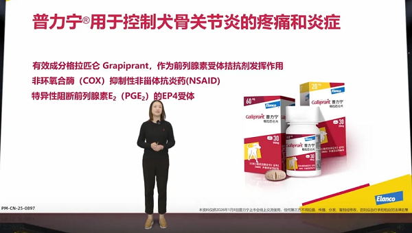 礼蓝宠物健康事业部产品部门负责人应悦佳,深度介绍了新品普力宁®(Galliprant®,格拉匹仑片)的相关信息。普力宁®的主要成分是格拉匹仑,是一种非环氧合酶(COX)抑制性非甾体类抗炎药(NSAID),是前列腺素E2(PGE2)EP4受体拮抗剂。EP4受体是负责调节PGE2引发炎症及疼痛的关键受体,是引起伤害感受的主要介质。格拉匹仑通过与PGE2的EP4受体结合,从而达到抗炎和镇痛的效果1。国外真实证据展示其良好的疗效与安全性,自2016年Galliprant®在境外上市以来,10年累计惠及了全球千万只患犬2。普力宁®在中国上市,是犬骨关节炎长期管理迈出的关键一步。