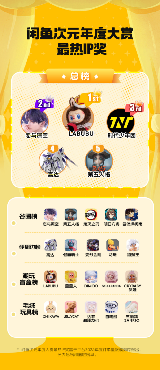 首届“闲鱼次元年度大赏”结果在报告中揭晓,直观反映了2025年二次元消费市场的潮流变迁。其中,星星人、哪吒、达菲和朋友们、LABUBU、CRYBABY哭娃凭借订单量的快速攀升,获评“异军突起IP奖”。“最热IP奖”也同步出炉,LABUBU、恋与深空、时代少年团、高达、第五人格位列总榜前五,成为过去一年闲鱼交易热度最高的次元IP。在商品层面,LABUBU-幸运、LABUBU-I FOUND YOU、DIMMO-米妮的气球、哪吒-战斗敖丙、普通站姿自嘲熊则成为年度“超热宝贝”。