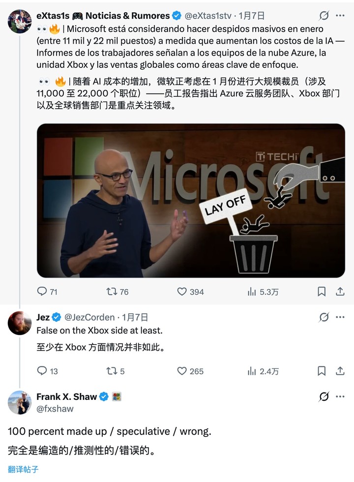 面对舆论发酵,微软高管迅速出面澄清。微软首席传播官弗兰克·肖(Frank Shaw)在 X 上表示,这些传言「百分之百是虚构的/是猜测的/是错误的」。
