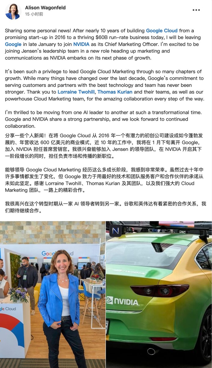 瓦贡菲尔德在领英上宣布,她将结束在 Google 近十年的任职,离开负责 Google 云业务营销的岗位,加入英伟达。