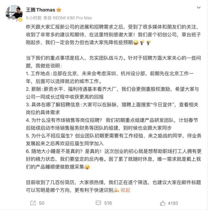 原小米中国区市场部总经理、REDMI 品牌总经理王腾在官宣成立新公司「今日宜休」后,于昨天再度发文披露公司招聘相关细节。