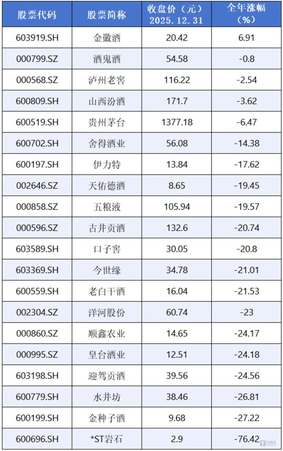 二级市场同步遇冷。从全年来看,白酒板块整体呈现“高位回落、震荡筑底”的特征。截至2025年12月31日,中证白酒指数报2694.38点,板块总市值降至2.88万亿元,较年内高点明显缩水,市盈率一度跌至近十年低位。个股中仅金徽酒实现微涨,11家公司跌幅超20%,反映出市场对行业短期前景的悲观预期。