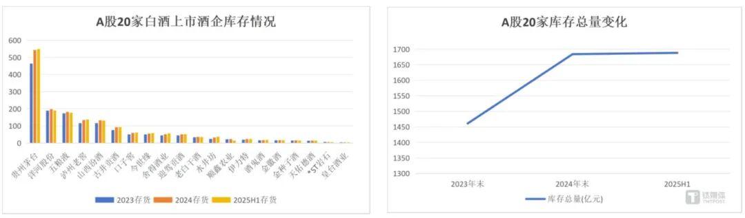 从规模以上企业库存总额来看,白酒库存呈现持续攀升态势:2023年20家白酒上市公司库存总额约1461亿元;2024年约1684亿元;2025年上半年超过1688亿元。