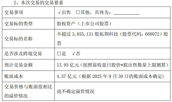 根据公告披露,中微公司于 2026 年 1 月 7 日召开第三届董事会第九次会议,审议并一致通过了《关于出售公司所持拓荆科技股份有限公司部分股票的议案》。公司拟出售拓荆科技股份数量不超过 3,655,131 股,占拓荆科技总股本的比例不超过 1.3%。本次交易预计金额达 13.93 亿元,该数值以拓荆科技前收盘日股价乘以拟出售数量上限测算得出,而截至 2025 年 9 月 30 日,该部分股票的账面成本为 4.57 亿元,目前溢价情况尚未确定。