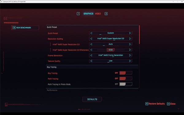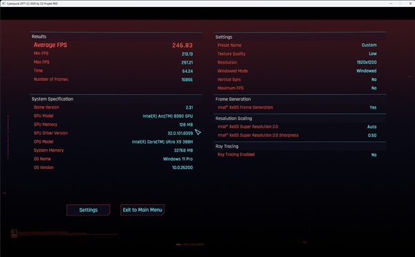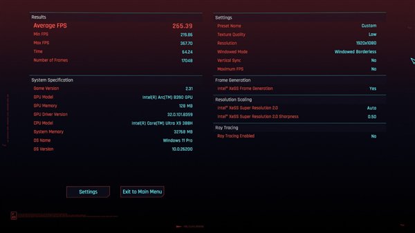 最后一款测试游戏是《赛博朋克2077》,考虑到这款游戏的性能要求,我们并未进行光追的测试,因为这对于集成显卡来说还是太难了。所以在低画质、1920x1080分辨率设定下,我们开启Intel XeSS以及帧生成探索了锐炫B390运行这款游戏的极限帧率。