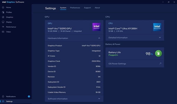 下图是通过Intel Graphics显卡控制面板检索的锐炫B390信息,可以点击图片放大查看,规格就不再赘述了。