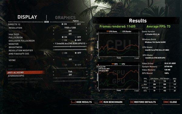 本篇评测里不同游戏的测试成绩由多家媒体同行共同完成,笔者负责的是《古墓丽影:暗影》的各项跑分。这是因为测试时间非常紧张,如果大家都各自去做测试,难免会有游戏上的重合,这会导致游戏测试数量较少,所以在这里先感谢各位媒体同行的贡献,让我们能够更加全面地了解锐炫B390核显的实际游戏性能表现。