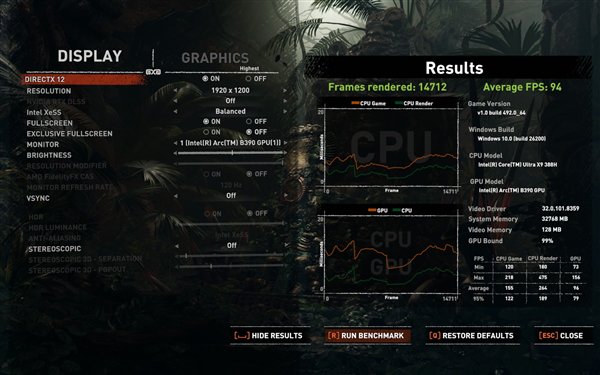 下面两张测试截图,第一张是在1920x1200分辨率高画质下的测试结果,平均帧率达到122.6fps,第二张是在1920x1200分辨率低画质下的测试结果,平均帧率达到171.8fps,对比上一代锐炫140V核显在1920x1200分辨率高画质下平均50fps的成绩,锐炫B390提升2.5倍,性能表现相当可观。