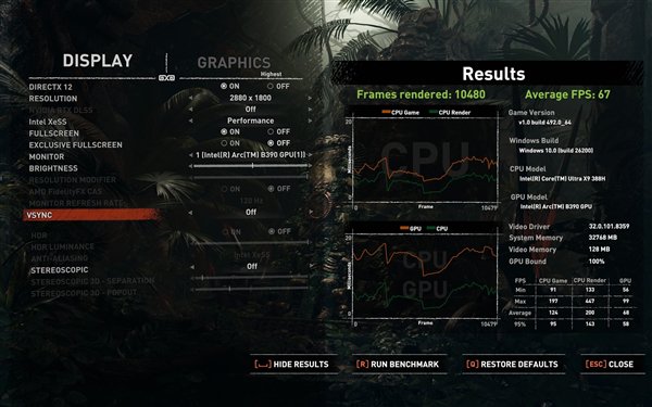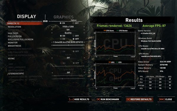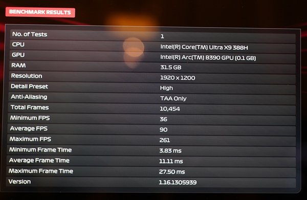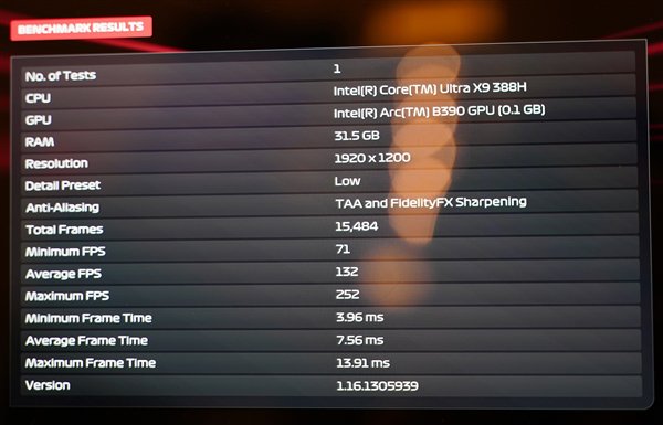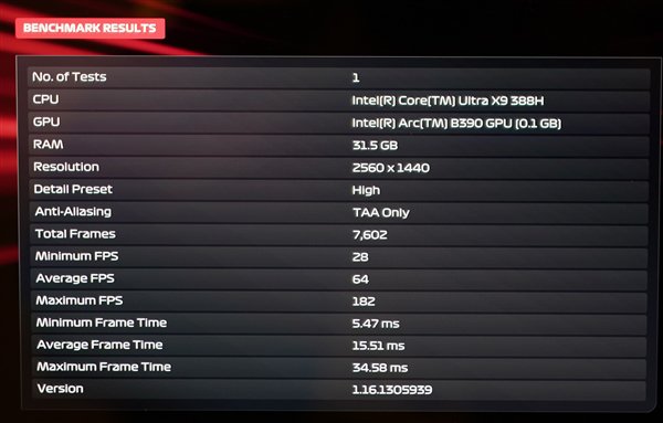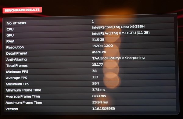 本次CES英特尔在发布会结束之后,允许媒体使用官方提供的联想小新Pro 16GT酷睿版对Ultra X9 388H处理器集成的锐炫B390核显进行游戏测试,最终结果说实话还是相当不错的,而且目前因为产品还未正式上市,所以一些驱动还并未完善,最终上市之后可能会有更好的表现。
