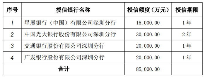 交通银行股份有限公司深圳分行:授信额度 20,000.00 万元,授信期限 1 年;