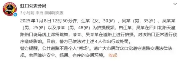 2026年1月8日12时50分许,江某(女,30岁)、吴某(男,35岁)、吴某某(男,25岁)以及漆某(男,48岁)为拍摄视频,由江某、吴某在四川北路天潼路路口斑马线上滞留跳舞,漆某、吴某某在道路上进行拍摄,对该路口正常通行秩序造成影响。目前,警方已依法对上述4人作出行政处罚。
