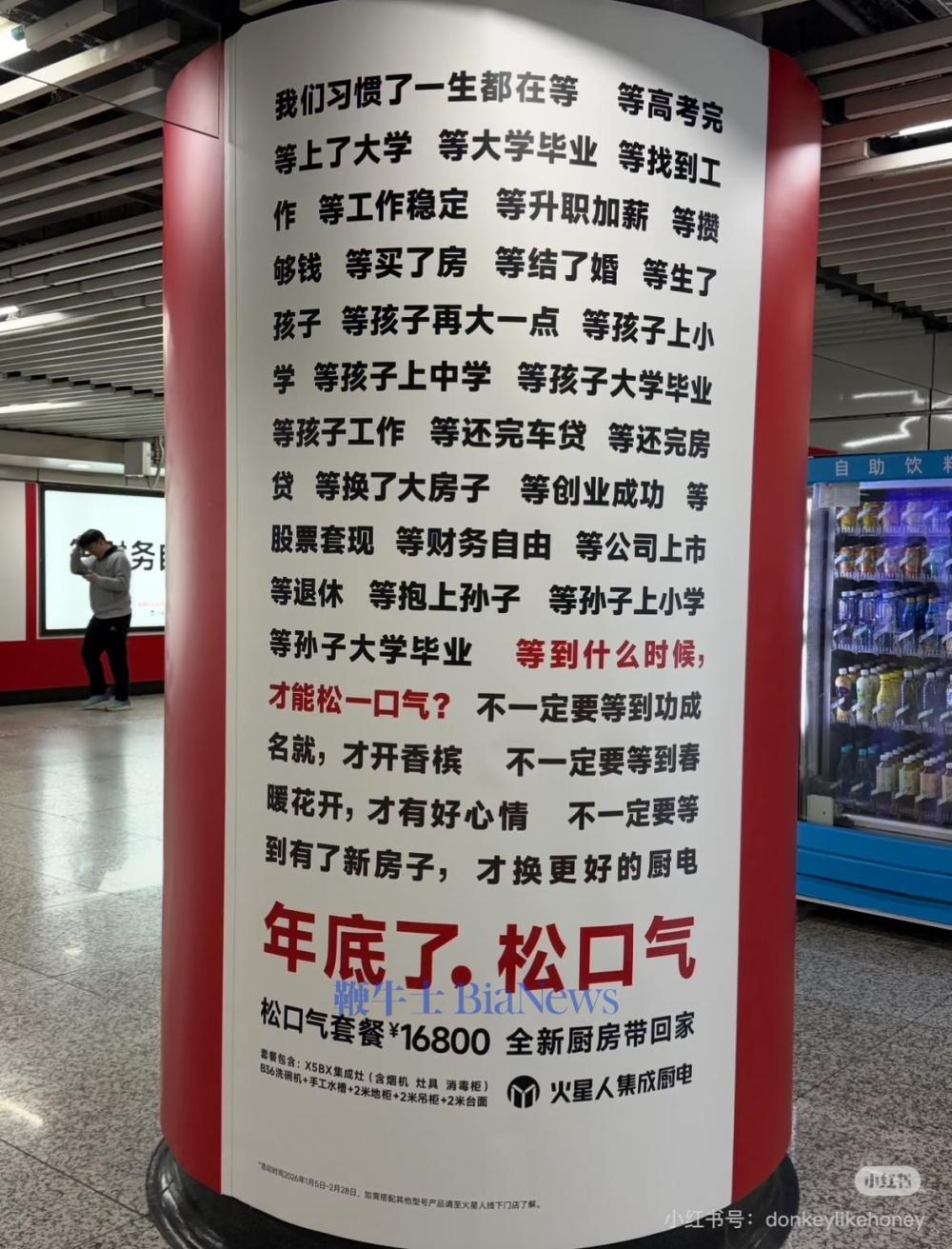 近日,上海地铁徐家汇站一则厨电广告引发网友热议,地铁站柱子及换乘通道的广告墙上,广告充斥着印着“等高考完,等上了大学”、“等生了孩子”、“等还完房贷”等高度密集性文案。