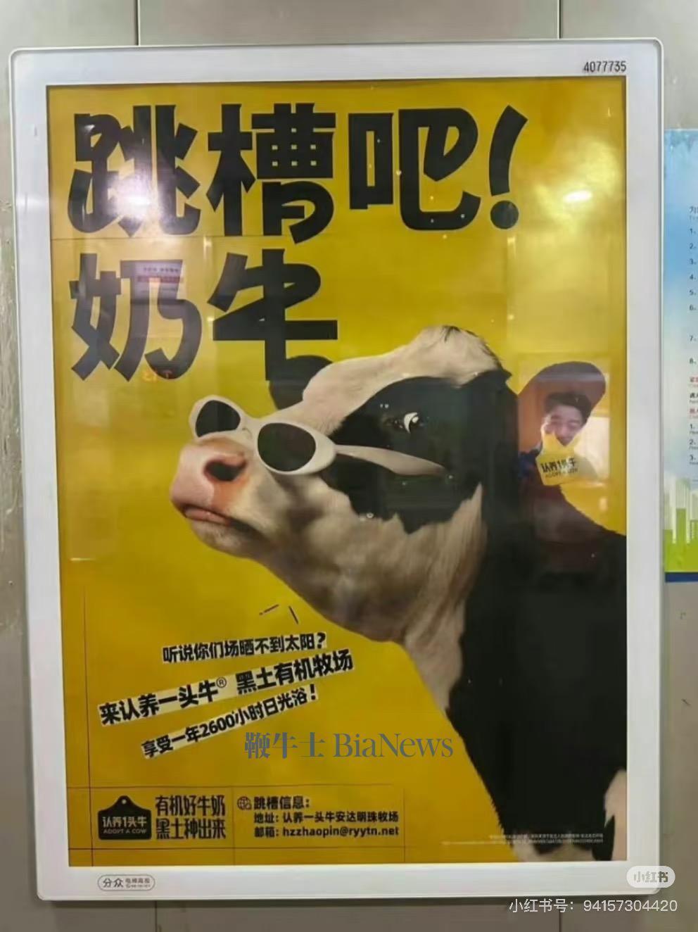 此外,认养一头牛广告也曾引发争议。广告文案包含“跳槽吧!奶牛,听说你们场晒不到太阳?”、“COWS直聘,找工作,直接跟老板哞。”等内容引起消费者反感与不满,认为该广告嘲讽“打工人”。