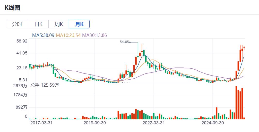 2025年最后一个交易日,公司收盘价报46.43元/股,较年内6.09元/股低点,涨幅近7倍。