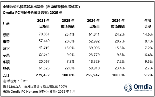 快科技1月13日消息,今日,市场调研机构Omdia发布2025年全球PC出货量数据。