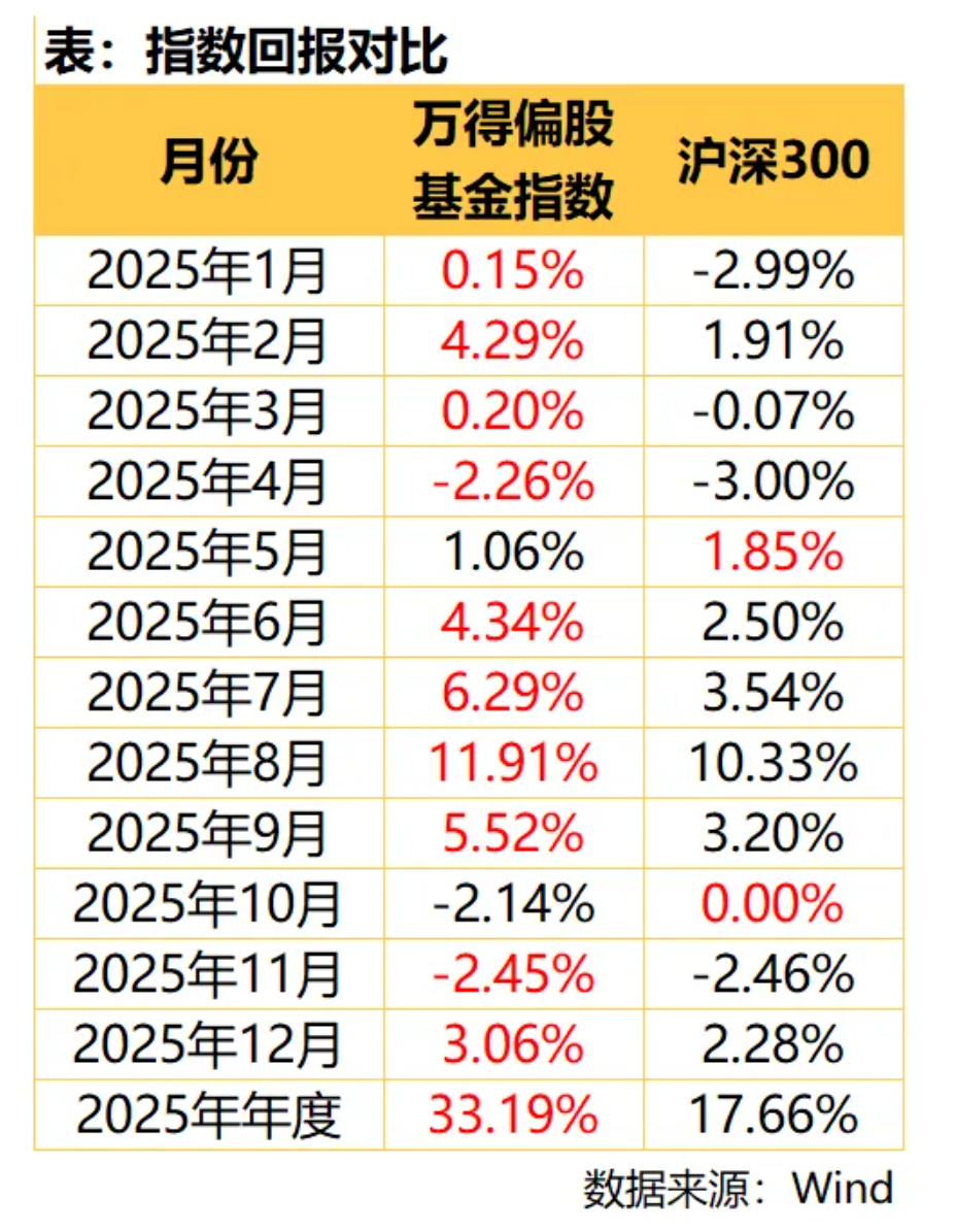 Wind数据统计显示,2025年全年12个月中,万得偏股混合型基金指数有10个月跑赢沪深300,月胜率高达83%。这不仅是“跟涨”,更是“持续地跑赢市场”。