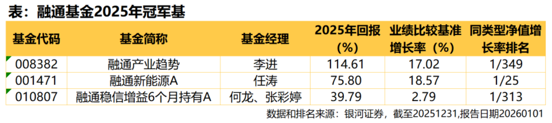 基金经理李进更是一马当先,凭借融通产业趋势拿下2025年年度股基冠军。这只基金2025年净值暴涨114.61%,远超17.02%的业绩比较基准,在349只同类标准股票型基金中排名第一。(排名数据来源:银河证券基金研究中心,截至20251231,报告日期20260101,具体排名为1/349,同类为银河证券1.1.1标准股票型基金(A类))