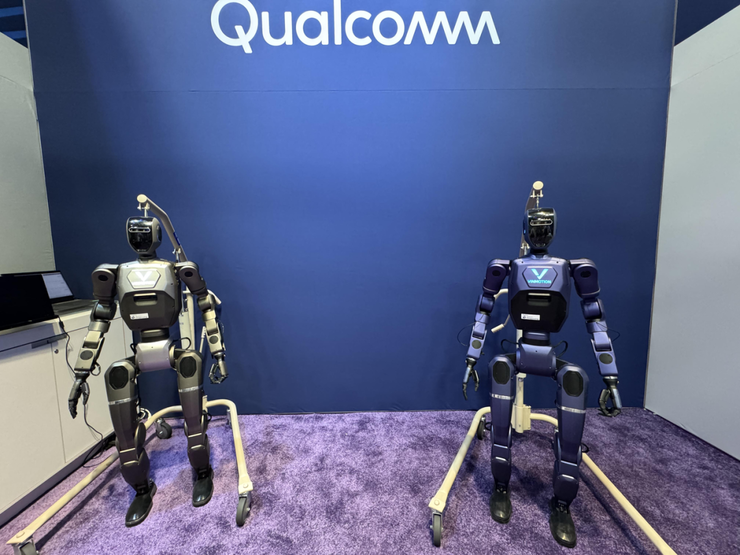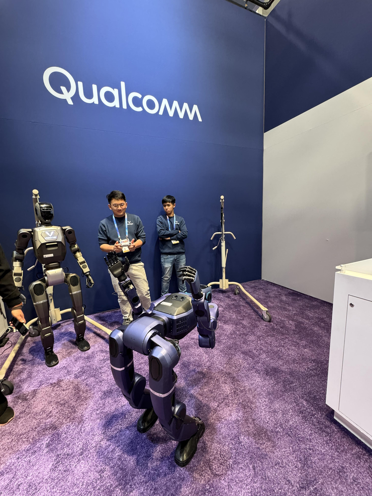 现场两台Vinmotion品牌人形机器人的“核心底气”来自高通端侧方案:将数百TOPS算力直接打进了机器人机身里,等于给这两台机器“装上了能支撑具身智能的算力引擎”。