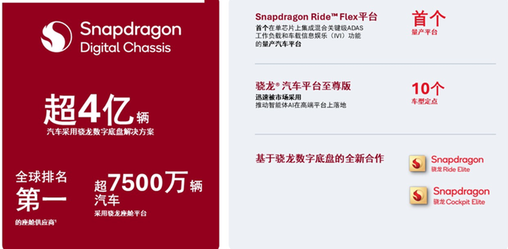 目前全球已有超过4亿辆汽车采用骁龙数字底盘解决方案。如今高通在车载信息娱乐和座舱SoC解决方案领域全球排名第一,全球已有超过7500万辆汽车采用骁龙座舱平台。