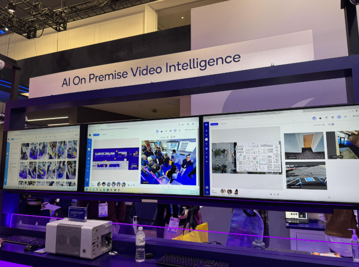 展台现场带来了AI本地化视频智能分析的演示,左边屏幕的多路监控画面在本地同步解析,中间屏实时标注出人群动态,右边屏甚至能生成空间布局的分析图。