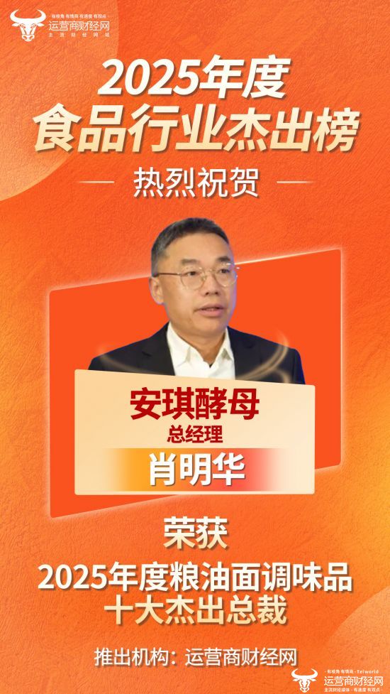近日,运营商财经网正式公布“2025年度粮油面调味品十大杰出总裁”榜单,安琪酵母总经理肖明华成功入选!