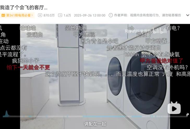 在B站,好的商业可以是好内容本身。2025年,品牌商单在B站每周必看榜的占比达到24%。A2奶粉和UP主@爱打灭霸的响指君,用自家猫咪和老鼠还原动画片《猫和老鼠》奶粉失窃的片段,激发起95后人群的童年回忆,也唤醒他们消费成人奶粉的需求;为了让用户对COLMO新品“云璃白”家电有最直观的了解,UP主@神奇阿宇Ayu脑洞大开,直接把客厅搬到2000米高空,在云层中体验“云璃白”电器。该视频不仅登上每周必看榜,屏幕中还不断涌现“甲方爸爸暗喜”等弹幕。