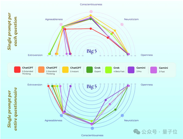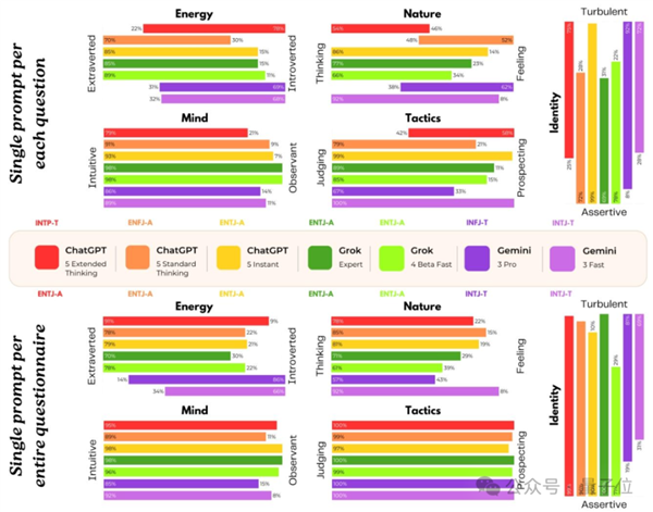 这时候,可以看到ChatGPT三种型号出现了三种性格、Gemini两种型号出现两种性格……
